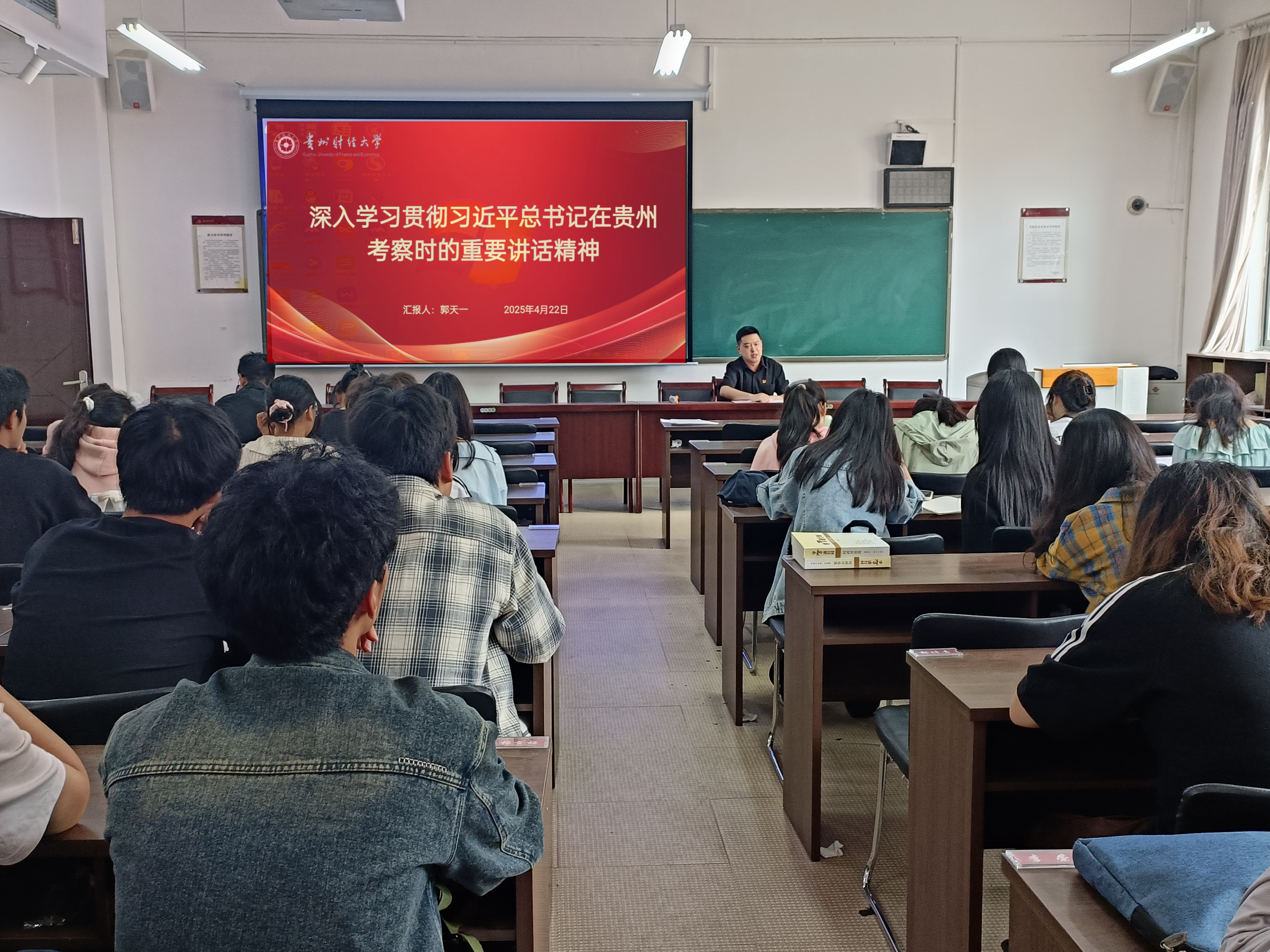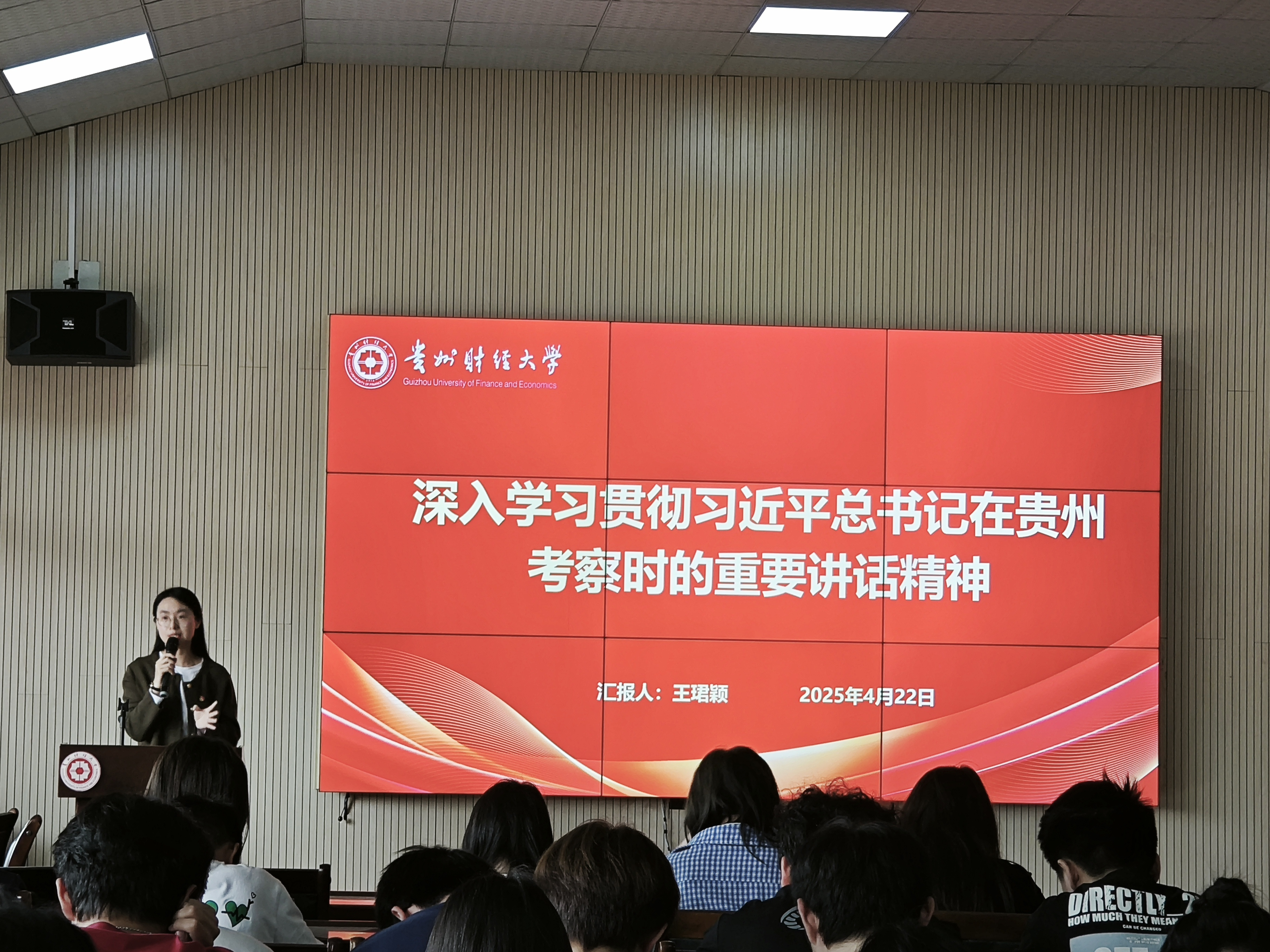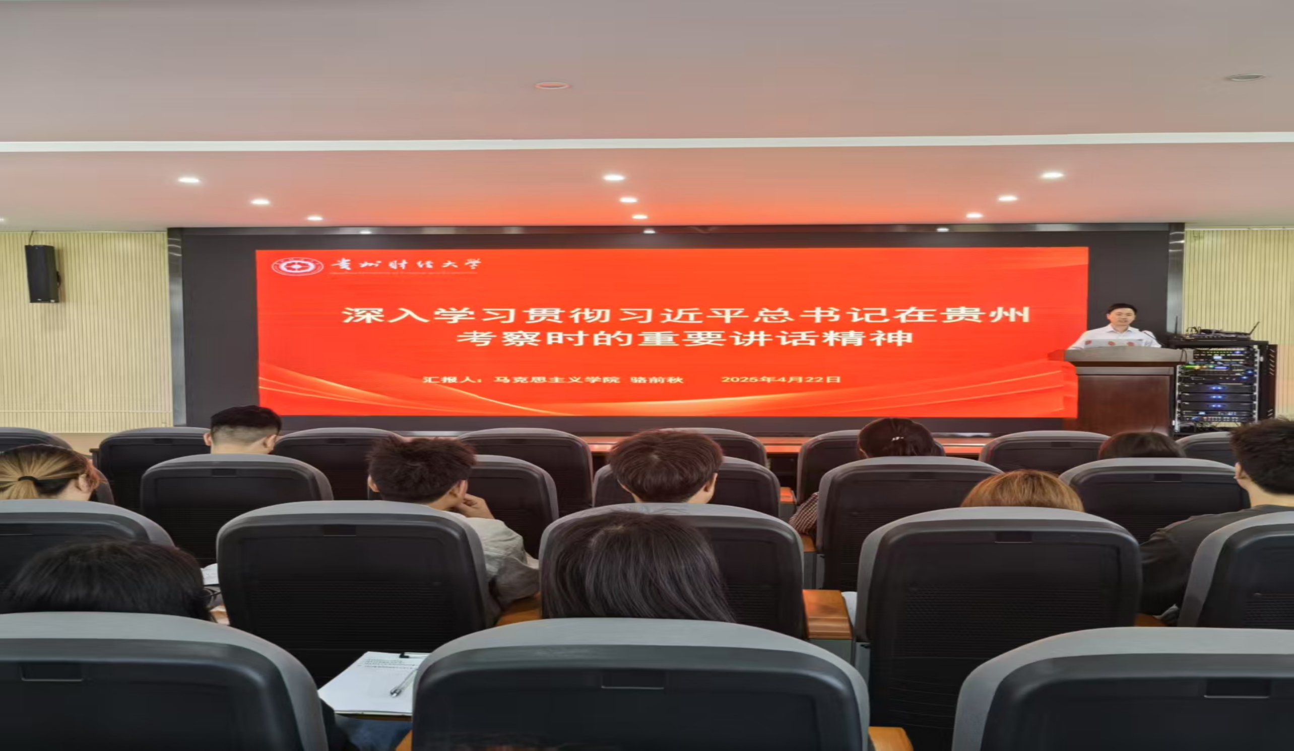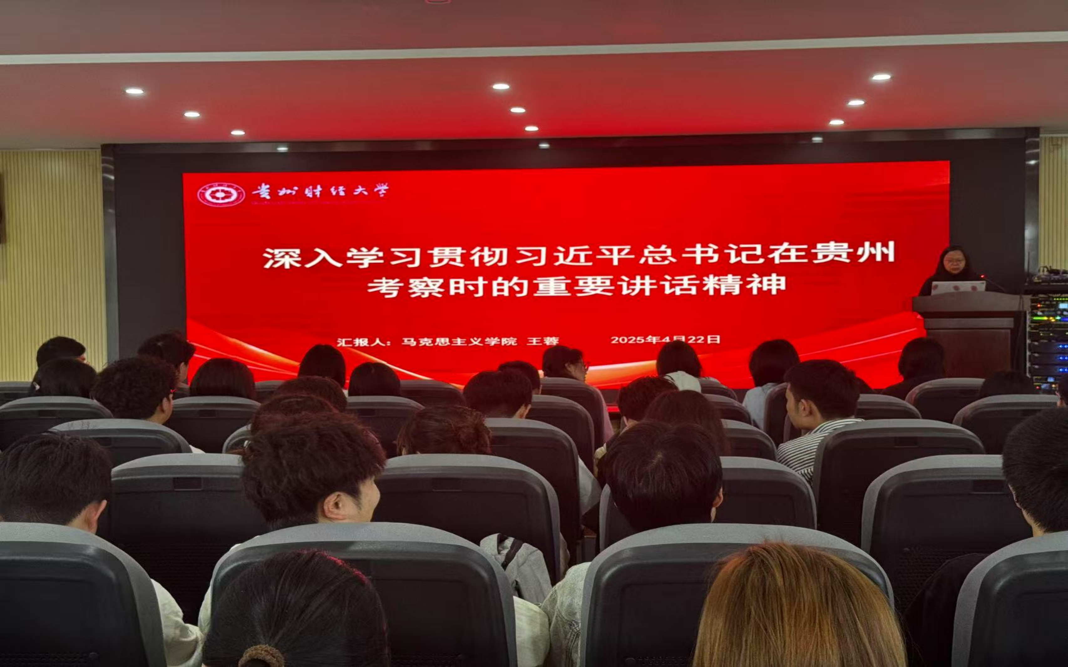 王蓉老师在信息学院为120名师生代表开展宣讲。王蓉老师全面深入解读习近平总书记对贵州发展的战略定位和重点任务,以我校为例阐述服务区域经济社会发展成果。她激励同学们汲取思想力量,落实讲话精神,展现贵财新风采。