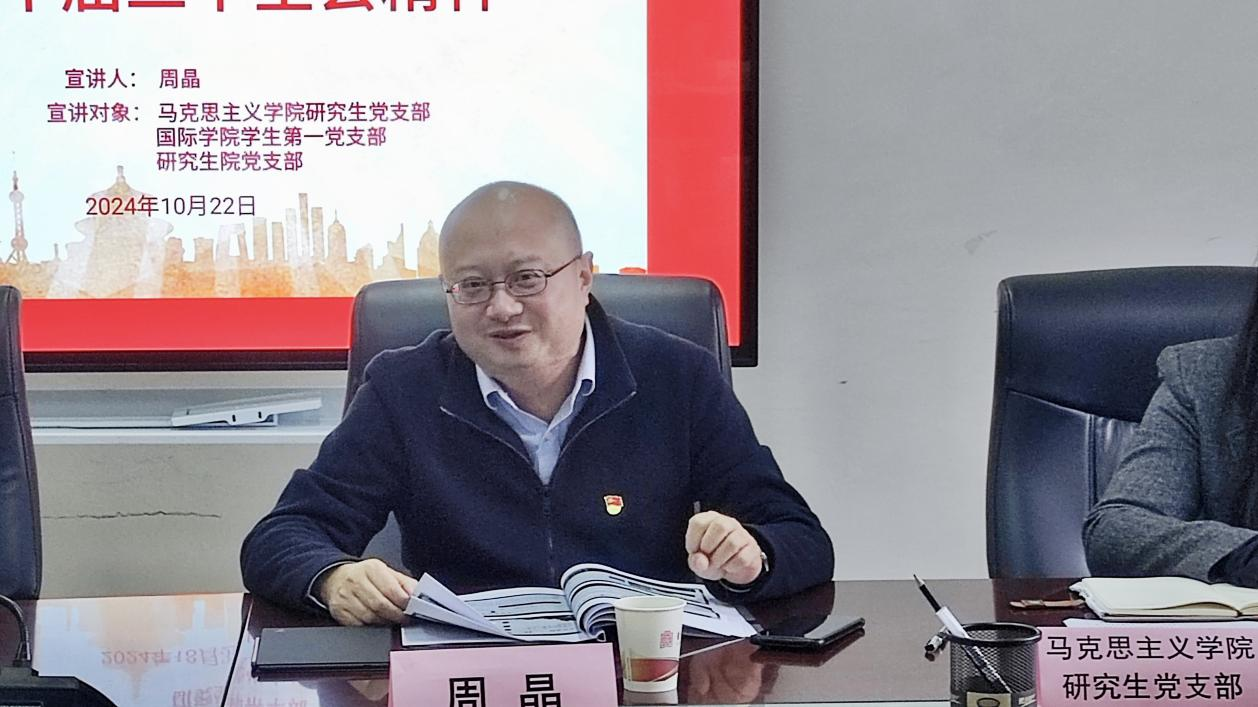为深入学习宣传贯彻党的二十届三中全会精神,2024 年 10 月 22 日 ,在国际学院正德楼 301 室,校党委委员、党委宣传部部长、yl88858永利集团党委书记周晶以党课的形式为yl88858永利集团研究生党支部、国际学院学生第一党支部、研究生院党支部成员进行党的二十届三中全会精神宣讲。