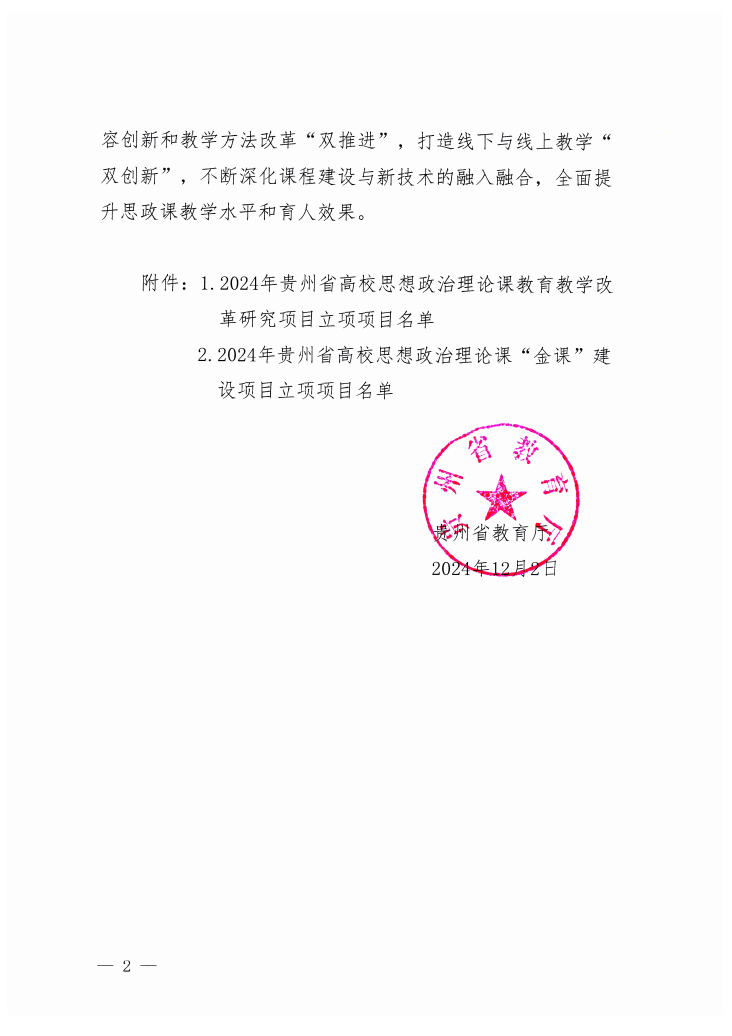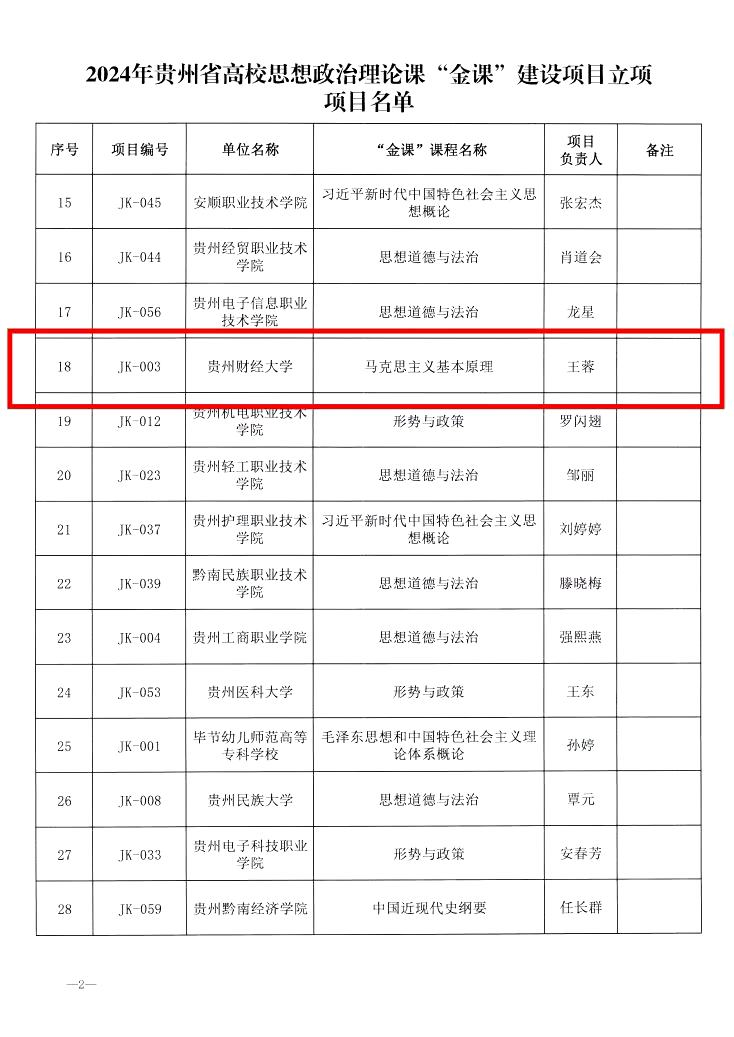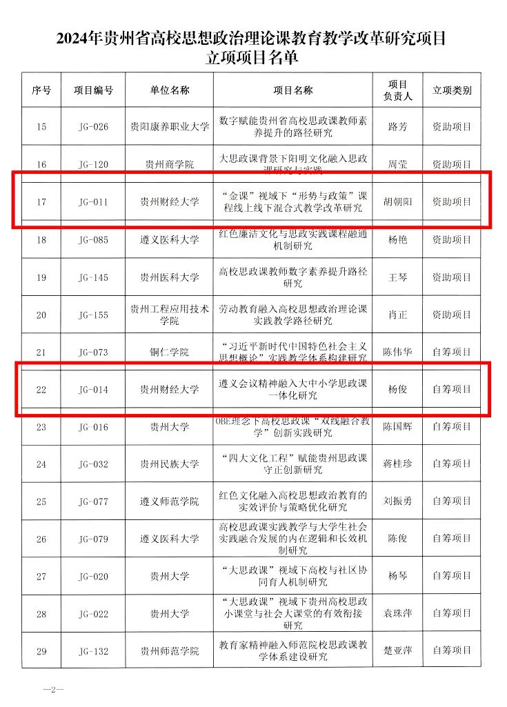 2024年12月2日贵州省教育厅公布了《2024年度贵州省高校思想政治理论课教育教学改革研究项目与思想政治理论课“金课”建设项目立项名单》,我院胡朝阳、杨俊、王蓉老师的项目成功立项。